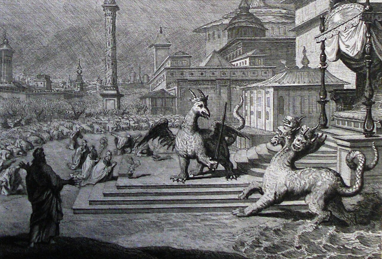 Image: Apocalypse 23. A beast with seven heads, Revelation cap 13. Mortier’s Bible. Phillip Medhurst Collection