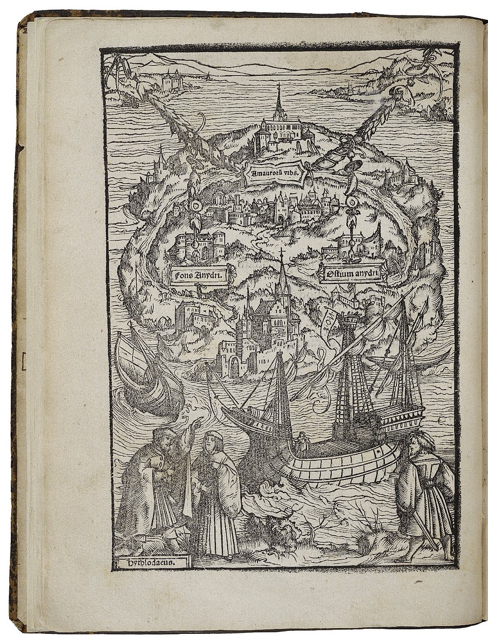 Picture: A woodcut by Ambrosius Holbein, illustrating a 1518 edition. In the lower left, Raphael describes the island Utopia.